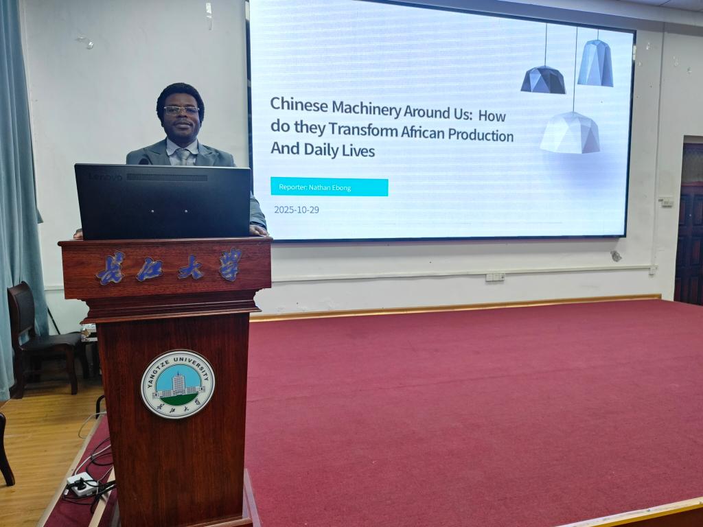 本次报告会的主讲人是机械工程学院机械工程专业尼日利亚籍硕士研究生阳光(NATHAN EBONG),报告会主题为《中国机械改变非洲日常生产和生活的研究》。阳光同学结合自身在尼日利亚的生活体验与学术研究积累,从农业生产、工业制造、日常出行、基础设施建设四个核心场景展开分享。他通过鲜活案例与直观对比,详细介绍了中国农机设备、小型机械工具、交通运输器械等在非洲的广泛应用 —— 从提升农业生产效率的联合收割机,到改变工坊加工模式的小型机床,再到便利日常出行的新能源车辆,中国机械以高性价比、适配性强的优势,逐步融入非洲人的生产生活各方面。他以尼日利亚当地农业合作社、小型加工厂为例,用详实的实际案例阐述了中国机械在降低生产成本、拓宽增收渠道等方面的具体作用,让现场听众直观感受到中国机械的“硬核实力”与温度。