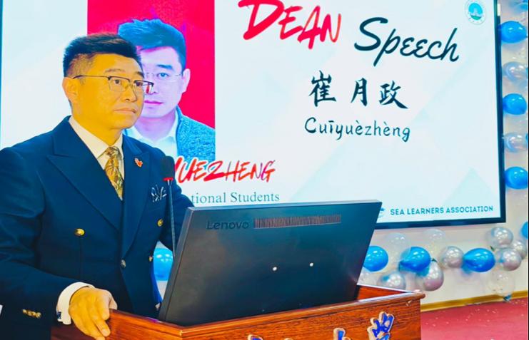 国际教育学院副院长崔月政发表致辞,向国际医学新生表示热烈祝贺。他表示,“医学是守护生命的崇高事业,关乎人类福祉与健康未来,责任重大且使命光荣。希望各位同学始终坚守‘健康所系,性命相托’的初心,以敬畏之心钻研医学知识,以专业之力践行医者担当。”