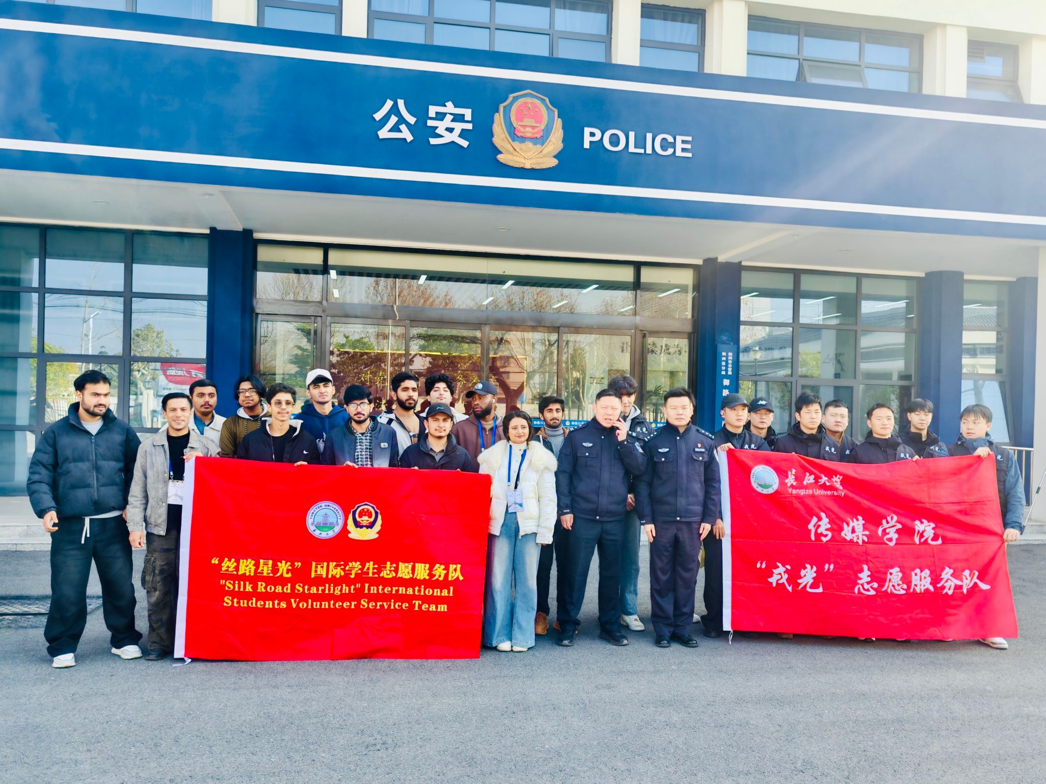 (通讯员 吴亮舟)为增进中外学生对我国警务工作的认知理解,厚植法治观念与社会责任感, 1 月 9 日,国际教育学院“丝路星光”国际学生志愿者服务队携手传媒学院“戎光”志愿者服务队,共同走进荆州区公安分局御路口派出所,沉浸式参与警营开放日活动,零距离感受现代警务工作的严谨规范与科技魅力。