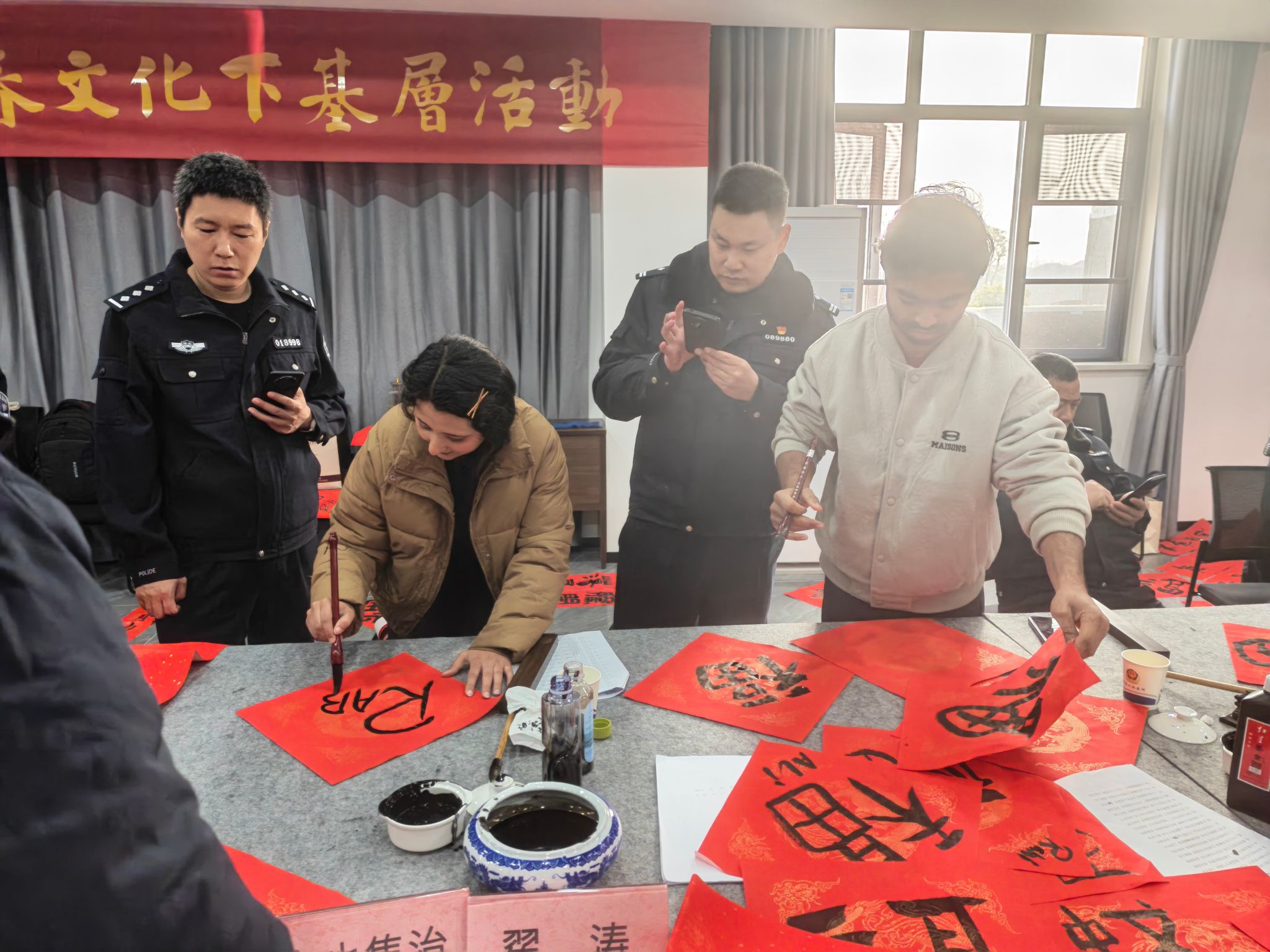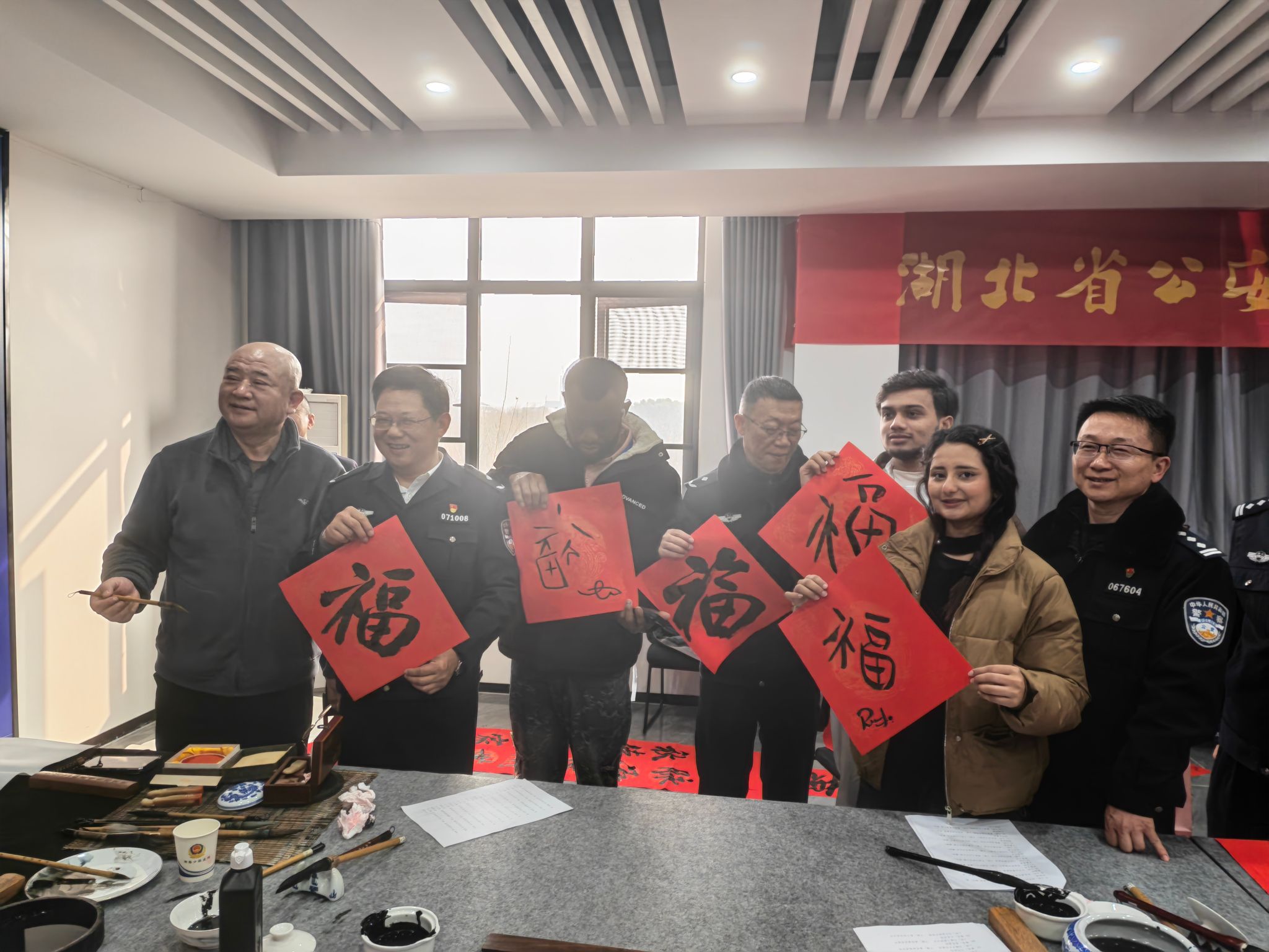 活动现场墨香四溢、暖意融融,氛围感拉满。书法家们提笔挥洒,笔锋遒劲有力,一幅幅饱含新春祝福的春联、一个个喜庆饱满的“福”字跃然红纸之上,将吉祥寓意融于笔墨之间。来自巴基斯坦、也门、尼日利亚等国家的国际学生们围在一旁,兴致盎然地观摩学习,在书法家与民警的耐心指导下,纷纷拿起毛笔尝试书写汉字“福”,还有学生用母语写下专属新年祝福,大家手持春联、福字合影留念,欢声笑语中尽显中外文化交融的温馨画面。
